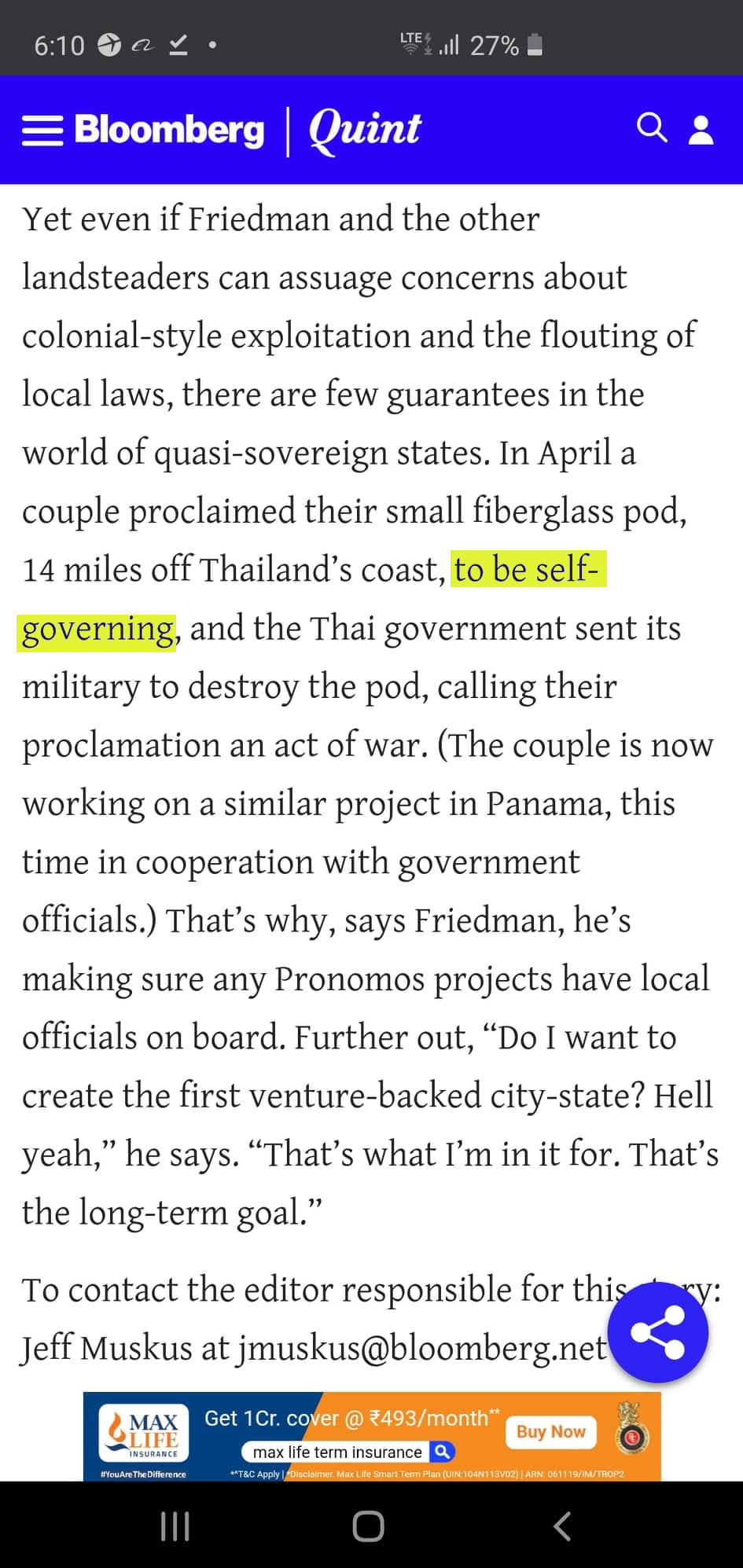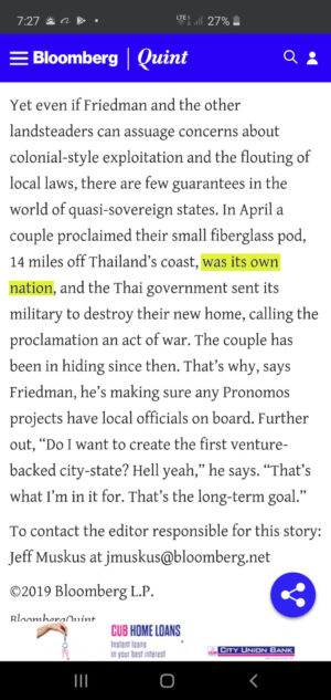 This week, Bloomberg finally admitted that there was no proof that they could find where Chad and Nadia (or Ocean Builders for that matter) was proclaiming a new nation. To their credit they did update the article focusing on the use of the word “governance” mentioned in the video. The updated blurb in the article refers to the proclamation of the home “to be self-governing”.